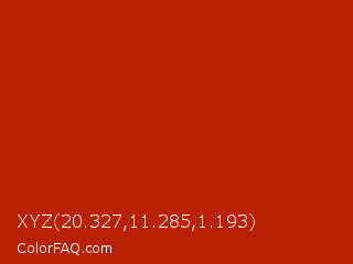 XYZ 20.327,11.285,1.193 Color is a normal red color and the nearest color is International Orange Engineering #ba160c. Hex code #b82103 and RGB value is rgb(184,33,3). In RGB color space, this color is composed of 72% red, 13% green, 1% blue, In CMYK color space, this color is composed of 0% cyan, 82% magenta, 98% yellow , 28% black , In HSL color space, this color has a hue angle of 10° , 97% saturation and 37% lightness.