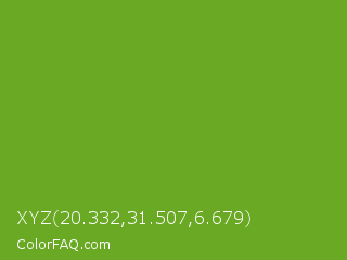 XYZ 20.332,31.507,6.679 Color is a normal green color and the nearest color is Green RYB #66b032. Hex code #69a924 and RGB value is rgb(105,169,36). In RGB color space, this color is composed of 41% red, 66% green, 14% blue, In CMYK color space, this color is composed of 38% cyan, 0% magenta, 79% yellow , 34% black , In HSL color space, this color has a hue angle of 89° , 65% saturation and 40% lightness.