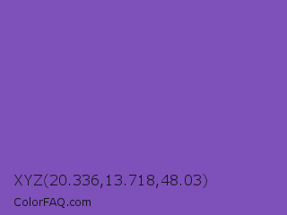 XYZ 20.336,13.718,48.03 Color is a normal violet color and the nearest color is Fuchsia Blue #7a58c1. Hex code #7e50ba and RGB value is rgb(126,80,186). In RGB color space, this color is composed of 49% red, 31% green, 73% blue, In CMYK color space, this color is composed of 32% cyan, 57% magenta, 0% yellow , 27% black , In HSL color space, this color has a hue angle of 266° , 43% saturation and 52% lightness.