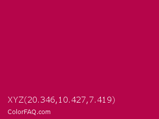XYZ 20.346,10.427,7.419 Color is a normal rose color and the nearest color is Pictorial Carmine #c30b4e. Hex code #b5054a and RGB value is rgb(181,5,74). In RGB color space, this color is composed of 71% red, 2% green, 29% blue, In CMYK color space, this color is composed of 0% cyan, 97% magenta, 59% yellow , 29% black , In HSL color space, this color has a hue angle of 336° , 95% saturation and 36% lightness.