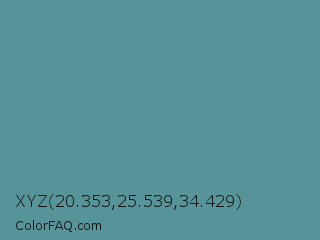 XYZ 20.353,25.539,34.429 Color is a normal cyan color and the nearest color is Cadet Blue #5f9ea0. Hex code #57949a and RGB value is rgb(87,148,154). In RGB color space, this color is composed of 34% red, 58% green, 60% blue, In CMYK color space, this color is composed of 44% cyan, 4% magenta, 0% yellow , 40% black , In HSL color space, this color has a hue angle of 185° , 28% saturation and 47% lightness.