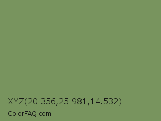 XYZ 20.356,25.981,14.532 Color is a normal green color and the nearest color is Highland #6f8e63. Hex code #78945e and RGB value is rgb(120,148,94). In RGB color space, this color is composed of 47% red, 58% green, 37% blue, In CMYK color space, this color is composed of 19% cyan, 0% magenta, 36% yellow , 42% black , In HSL color space, this color has a hue angle of 91° , 22% saturation and 47% lightness.
