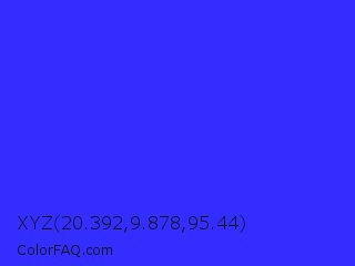 XYZ 20.392,9.878,95.44 Color is a normal indigo color and the nearest color is Bluebonnet #1c1cf0. Hex code #332eff and RGB value is rgb(51,46,255). In RGB color space, this color is composed of 20% red, 18% green, 100% blue, In CMYK color space, this color is composed of 80% cyan, 82% magenta, 0% yellow , 0% black , In HSL color space, this color has a hue angle of 241° , 100% saturation and 59% lightness.