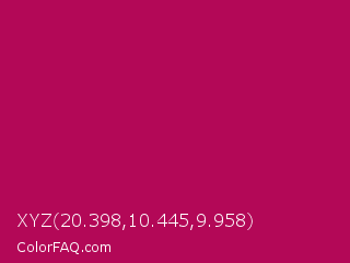XYZ 20.398,10.445,9.958 Color is a normal rose color and the nearest color is Lipstick #ab0563. Hex code #b30857 and RGB value is rgb(179,8,87). In RGB color space, this color is composed of 70% red, 3% green, 34% blue, In CMYK color space, this color is composed of 0% cyan, 96% magenta, 51% yellow , 30% black , In HSL color space, this color has a hue angle of 332° , 91% saturation and 37% lightness.