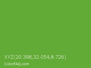 XYZ 20.398,32.054,8.726 Color is a normal green color and the nearest color is Green RYB #66b032. Hex code #63ab37 and RGB value is rgb(99,171,55). In RGB color space, this color is composed of 39% red, 67% green, 22% blue, In CMYK color space, this color is composed of 42% cyan, 0% magenta, 68% yellow , 33% black , In HSL color space, this color has a hue angle of 97° , 51% saturation and 44% lightness.