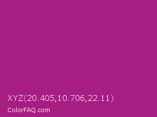 XYZ 20.405,10.706,22.11 Color is a normal magenta color and the nearest color is Fandango #b53389. Hex code #a71d82 and RGB value is rgb(167,29,130). In RGB color space, this color is composed of 65% red, 11% green, 51% blue, In CMYK color space, this color is composed of 0% cyan, 83% magenta, 22% yellow , 35% black , In HSL color space, this color has a hue angle of 316° , 70% saturation and 38% lightness.