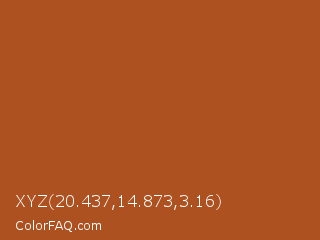 XYZ 20.437,14.873,3.16 Color is a normal orange color and the nearest color is Paarl #a65529. Hex code #ad5120 and RGB value is rgb(173,81,32). In RGB color space, this color is composed of 68% red, 32% green, 13% blue, In CMYK color space, this color is composed of 0% cyan, 53% magenta, 82% yellow , 32% black , In HSL color space, this color has a hue angle of 21° , 69% saturation and 40% lightness.