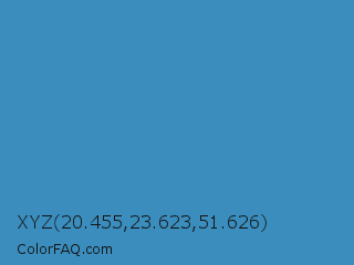 XYZ 20.455,23.623,51.626 Color is a normal blue color and the nearest color is Boston Blue #3b91b4. Hex code #3a8dbd and RGB value is rgb(58,141,189). In RGB color space, this color is composed of 23% red, 55% green, 74% blue, In CMYK color space, this color is composed of 69% cyan, 25% magenta, 0% yellow , 26% black , In HSL color space, this color has a hue angle of 202° , 53% saturation and 48% lightness.