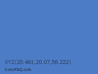 XYZ 20.461,20.07,56.222 Color is a normal blue color and the nearest color is Cyan Blue Azure #4682bf. Hex code #4d7cc6 and RGB value is rgb(77,124,198). In RGB color space, this color is composed of 30% red, 49% green, 78% blue, In CMYK color space, this color is composed of 61% cyan, 37% magenta, 0% yellow , 22% black , In HSL color space, this color has a hue angle of 217° , 51% saturation and 54% lightness.
