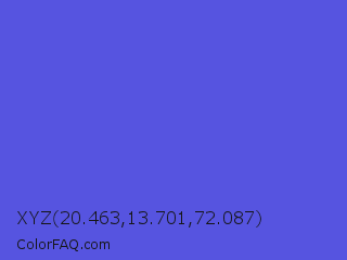 XYZ 20.463,13.701,72.087 Color is a normal indigo color and the nearest color is Majorelle Blue #6050dc. Hex code #5654e0 and RGB value is rgb(86,84,224). In RGB color space, this color is composed of 34% red, 33% green, 88% blue, In CMYK color space, this color is composed of 62% cyan, 63% magenta, 0% yellow , 12% black , In HSL color space, this color has a hue angle of 241° , 69% saturation and 60% lightness.