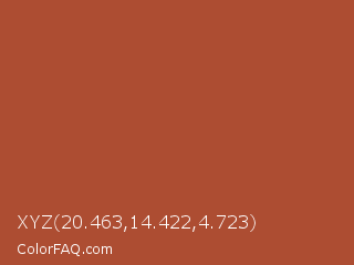 XYZ 20.463,14.422,4.723 Color is a normal red color and the nearest color is Medium Carmine #af4035. Hex code #ad4d32 and RGB value is rgb(173,77,50). In RGB color space, this color is composed of 68% red, 30% green, 20% blue, In CMYK color space, this color is composed of 0% cyan, 55% magenta, 71% yellow , 32% black , In HSL color space, this color has a hue angle of 13° , 55% saturation and 44% lightness.