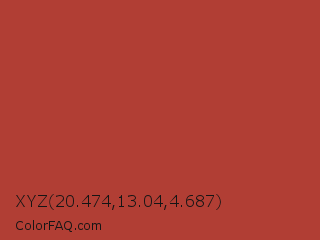 XYZ 20.474,13.04,4.687 Color is a normal red color and the nearest color is Medium Carmine #af4035. Hex code #b13e34 and RGB value is rgb(177,62,52). In RGB color space, this color is composed of 69% red, 24% green, 20% blue, In CMYK color space, this color is composed of 0% cyan, 65% magenta, 71% yellow , 31% black , In HSL color space, this color has a hue angle of 5° , 55% saturation and 45% lightness.