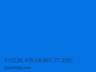 XYZ 20.476,18.007,77.259 Color is a normal blue color and the nearest color is True Blue #0073cf. Hex code #0573e6 and RGB value is rgb(5,115,230). In RGB color space, this color is composed of 2% red, 45% green, 90% blue, In CMYK color space, this color is composed of 98% cyan, 50% magenta, 0% yellow , 10% black , In HSL color space, this color has a hue angle of 211° , 96% saturation and 46% lightness.