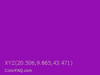 XYZ 20.506,9.865,43.471 Color is a normal purple color and the nearest color is Violet RYB #8601af. Hex code #940eb3 and RGB value is rgb(148,14,179). In RGB color space, this color is composed of 58% red, 5% green, 70% blue, In CMYK color space, this color is composed of 17% cyan, 92% magenta, 0% yellow , 30% black , In HSL color space, this color has a hue angle of 289° , 85% saturation and 38% lightness.