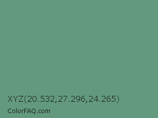 XYZ 20.532,27.296,24.265 Color is a normal green color and the nearest color is Shiny Shamrock #5fa778. Hex code #639a7f and RGB value is rgb(99,154,127). In RGB color space, this color is composed of 39% red, 60% green, 50% blue, In CMYK color space, this color is composed of 36% cyan, 0% magenta, 18% yellow , 40% black , In HSL color space, this color has a hue angle of 151° , 22% saturation and 50% lightness.