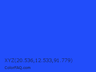 XYZ 20.536,12.533,91.779 Color is a normal blue color and the nearest color is Palatinate Blue #273be2. Hex code #214dfa and RGB value is rgb(33,77,250). In RGB color space, this color is composed of 13% red, 30% green, 98% blue, In CMYK color space, this color is composed of 87% cyan, 69% magenta, 0% yellow , 2% black , In HSL color space, this color has a hue angle of 228° , 96% saturation and 55% lightness.