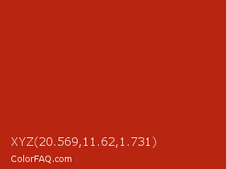 XYZ 20.569,11.62,1.731 Color is a normal red color and the nearest color is Thunderbird #c02b18. Hex code #b82612 and RGB value is rgb(184,38,18). In RGB color space, this color is composed of 72% red, 15% green, 7% blue, In CMYK color space, this color is composed of 0% cyan, 79% magenta, 90% yellow , 28% black , In HSL color space, this color has a hue angle of 7° , 82% saturation and 40% lightness.
