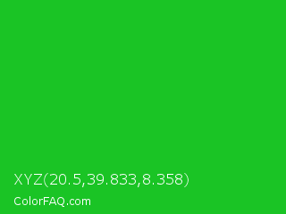 XYZ 20.5,39.833,8.358 Color is a normal green color and the nearest color is Lime Green #32cd32. Hex code #1ac425 and RGB value is rgb(26,196,37). In RGB color space, this color is composed of 10% red, 77% green, 15% blue, In CMYK color space, this color is composed of 87% cyan, 0% magenta, 81% yellow , 23% black , In HSL color space, this color has a hue angle of 124° , 77% saturation and 44% lightness.