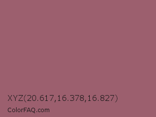 XYZ 20.617,16.378,16.827 Color is a normal red color and the nearest color is Rose Dust #9e5e6f. Hex code #9c5f6e and RGB value is rgb(156,95,110). In RGB color space, this color is composed of 61% red, 37% green, 43% blue, In CMYK color space, this color is composed of 0% cyan, 39% magenta, 29% yellow , 39% black , In HSL color space, this color has a hue angle of 345° , 24% saturation and 49% lightness.
