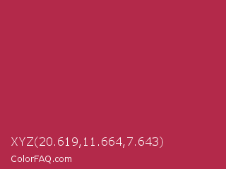 XYZ 20.619,11.664,7.643 Color is a normal red color and the nearest color is Amaranth Purple #ab274f. Hex code #b3294a and RGB value is rgb(179,41,74). In RGB color space, this color is composed of 70% red, 16% green, 29% blue, In CMYK color space, this color is composed of 0% cyan, 77% magenta, 59% yellow , 30% black , In HSL color space, this color has a hue angle of 346° , 63% saturation and 43% lightness.