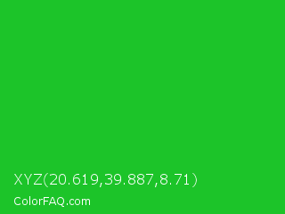 XYZ 20.619,39.887,8.71 Color is a normal green color and the nearest color is Lime Green #32cd32. Hex code #1cc429 and RGB value is rgb(28,196,41). In RGB color space, this color is composed of 11% red, 77% green, 16% blue, In CMYK color space, this color is composed of 86% cyan, 0% magenta, 79% yellow , 23% black , In HSL color space, this color has a hue angle of 125° , 75% saturation and 44% lightness.