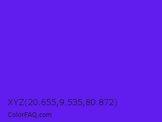 XYZ 20.655,9.535,80.872 Color is a normal indigo color and the nearest color is Han Purple #5218fa. Hex code #611ded and RGB value is rgb(97,29,237). In RGB color space, this color is composed of 38% red, 11% green, 93% blue, In CMYK color space, this color is composed of 59% cyan, 88% magenta, 0% yellow , 7% black , In HSL color space, this color has a hue angle of 260° , 85% saturation and 52% lightness.