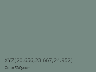 XYZ 20.656,23.667,24.952 Color is a normal green color and the nearest color is Blue Smoke #748881. Hex code #768a83 and RGB value is rgb(118,138,131). In RGB color space, this color is composed of 46% red, 54% green, 51% blue, In CMYK color space, this color is composed of 14% cyan, 0% magenta, 5% yellow , 46% black , In HSL color space, this color has a hue angle of 159° , 8% saturation and 50% lightness.
