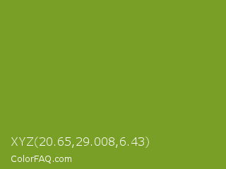 XYZ 20.65,29.008,6.43 Color is a normal lime color and the nearest color is Wasabi #788a25. Hex code #799f27 and RGB value is rgb(121,159,39). In RGB color space, this color is composed of 47% red, 62% green, 15% blue, In CMYK color space, this color is composed of 24% cyan, 0% magenta, 75% yellow , 38% black , In HSL color space, this color has a hue angle of 79° , 61% saturation and 39% lightness.