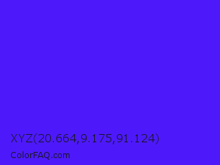 XYZ 20.664,9.175,91.124 Color is a normal indigo color and the nearest color is Han Purple #5218fa. Hex code #4d19fa and RGB value is rgb(77,25,250). In RGB color space, this color is composed of 30% red, 10% green, 98% blue, In CMYK color space, this color is composed of 69% cyan, 90% magenta, 0% yellow , 2% black , In HSL color space, this color has a hue angle of 254° , 96% saturation and 54% lightness.