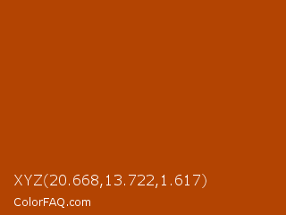 XYZ 20.668,13.722,1.617 Color is a normal orange color and the nearest color is Fire #aa4203. Hex code #b34402 and RGB value is rgb(179,68,2). In RGB color space, this color is composed of 70% red, 27% green, 1% blue, In CMYK color space, this color is composed of 0% cyan, 62% magenta, 99% yellow , 30% black , In HSL color space, this color has a hue angle of 22° , 98% saturation and 35% lightness.