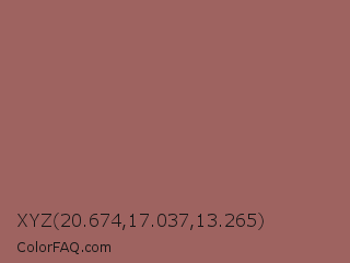 XYZ 20.674,17.037,13.265 Color is a normal red color and the nearest color is Au Chico #97605d. Hex code #9e6360 and RGB value is rgb(158,99,96). In RGB color space, this color is composed of 62% red, 39% green, 38% blue, In CMYK color space, this color is composed of 0% cyan, 37% magenta, 39% yellow , 38% black , In HSL color space, this color has a hue angle of 3° , 24% saturation and 50% lightness.