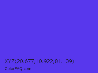 XYZ 20.677,10.922,81.139 Color is a normal indigo color and the nearest color is Majorelle Blue #6050dc. Hex code #5837ed and RGB value is rgb(88,55,237). In RGB color space, this color is composed of 35% red, 22% green, 93% blue, In CMYK color space, this color is composed of 63% cyan, 77% magenta, 0% yellow , 7% black , In HSL color space, this color has a hue angle of 251° , 83% saturation and 57% lightness.