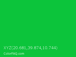 XYZ 20.681,39.874,10.744 Color is a normal green color and the nearest color is Dark Pastel Green #03c03c. Hex code #0cc43b and RGB value is rgb(12,196,59). In RGB color space, this color is composed of 5% red, 77% green, 23% blue, In CMYK color space, this color is composed of 94% cyan, 0% magenta, 70% yellow , 23% black , In HSL color space, this color has a hue angle of 135° , 88% saturation and 41% lightness.