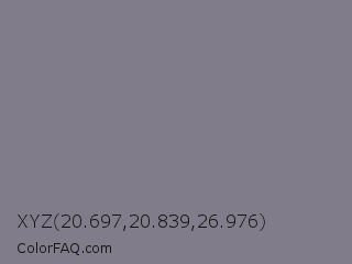 XYZ 20.697,20.839,26.976 Color is a normal indigo color and the nearest color is Topaz #7c778a. Hex code #807c8a and RGB value is rgb(128,124,138). In RGB color space, this color is composed of 50% red, 49% green, 54% blue, In CMYK color space, this color is composed of 7% cyan, 10% magenta, 0% yellow , 46% black , In HSL color space, this color has a hue angle of 257° , 6% saturation and 51% lightness.