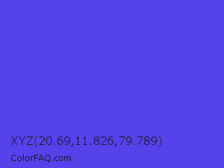 XYZ 20.69,11.826,79.789 Color is a normal indigo color and the nearest color is Majorelle Blue #6050dc. Hex code #5542eb and RGB value is rgb(85,66,235). In RGB color space, this color is composed of 33% red, 26% green, 92% blue, In CMYK color space, this color is composed of 64% cyan, 72% magenta, 0% yellow , 8% black , In HSL color space, this color has a hue angle of 247° , 81% saturation and 59% lightness.