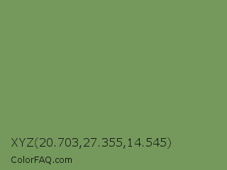 XYZ 20.703,27.355,14.545 Color is a normal green color and the nearest color is Asparagus Green #7ba05b. Hex code #75995d and RGB value is rgb(117,153,93). In RGB color space, this color is composed of 46% red, 60% green, 36% blue, In CMYK color space, this color is composed of 24% cyan, 0% magenta, 39% yellow , 40% black , In HSL color space, this color has a hue angle of 96° , 24% saturation and 48% lightness.