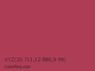 XYZ 20.711,12.886,9.99 Color is a normal red color and the nearest color is Night Shadz #aa375a. Hex code #ae3c55 and RGB value is rgb(174,60,85). In RGB color space, this color is composed of 68% red, 24% green, 33% blue, In CMYK color space, this color is composed of 0% cyan, 66% magenta, 51% yellow , 32% black , In HSL color space, this color has a hue angle of 347° , 49% saturation and 46% lightness.