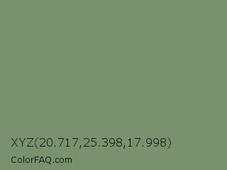 XYZ 20.717,25.398,17.998 Color is a normal green color and the nearest color is Battleship Gray #828f72. Hex code #79916c and RGB value is rgb(121,145,108). In RGB color space, this color is composed of 47% red, 57% green, 42% blue, In CMYK color space, this color is composed of 17% cyan, 0% magenta, 26% yellow , 43% black , In HSL color space, this color has a hue angle of 99° , 15% saturation and 50% lightness.