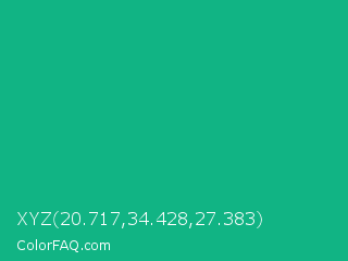 XYZ 20.717,34.428,27.383 Color is a normal green color and the nearest color is Mountain Meadow Crayola #1ab385. Hex code #11b484 and RGB value is rgb(17,180,132). In RGB color space, this color is composed of 7% red, 71% green, 52% blue, In CMYK color space, this color is composed of 91% cyan, 0% magenta, 27% yellow , 29% black , In HSL color space, this color has a hue angle of 162° , 83% saturation and 39% lightness.