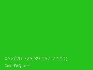 XYZ 20.726,39.967,7.599 Color is a normal green color and the nearest color is Lime Green #32cd32. Hex code #26c41a and RGB value is rgb(38,196,26). In RGB color space, this color is composed of 15% red, 77% green, 10% blue, In CMYK color space, this color is composed of 81% cyan, 0% magenta, 87% yellow , 23% black , In HSL color space, this color has a hue angle of 116° , 77% saturation and 44% lightness.