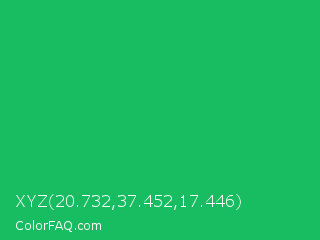 XYZ 20.732,37.452,17.446 Color is a normal green color and the nearest color is Green Crayola #1cac78. Hex code #18bd61 and RGB value is rgb(24,189,97). In RGB color space, this color is composed of 9% red, 74% green, 38% blue, In CMYK color space, this color is composed of 87% cyan, 0% magenta, 49% yellow , 26% black , In HSL color space, this color has a hue angle of 147° , 77% saturation and 42% lightness.