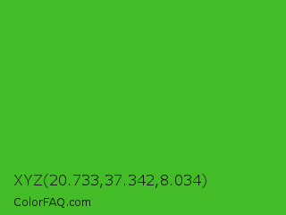 XYZ 20.733,37.342,8.034 Color is a normal green color and the nearest color is Kelly Green #4cbb17. Hex code #44bc27 and RGB value is rgb(68,188,39). In RGB color space, this color is composed of 27% red, 74% green, 15% blue, In CMYK color space, this color is composed of 64% cyan, 0% magenta, 79% yellow , 26% black , In HSL color space, this color has a hue angle of 108° , 66% saturation and 45% lightness.