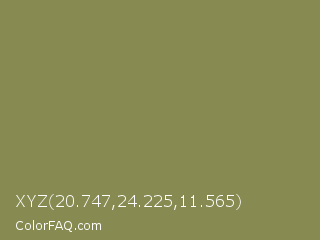 XYZ 20.747,24.225,11.565 Color is a normal yellow color and the nearest color is Dark Tan #918151. Hex code #878b52 and RGB value is rgb(135,139,82). In RGB color space, this color is composed of 53% red, 55% green, 32% blue, In CMYK color space, this color is composed of 3% cyan, 0% magenta, 41% yellow , 45% black , In HSL color space, this color has a hue angle of 64° , 26% saturation and 43% lightness.