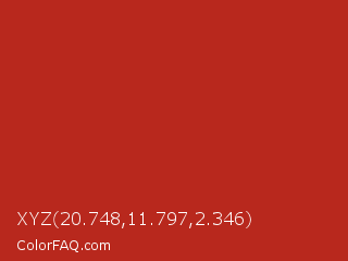 XYZ 20.748,11.797,2.346 Color is a normal red color and the nearest color is Firebrick #b22222. Hex code #b8281d and RGB value is rgb(184,40,29). In RGB color space, this color is composed of 72% red, 16% green, 11% blue, In CMYK color space, this color is composed of 0% cyan, 78% magenta, 84% yellow , 28% black , In HSL color space, this color has a hue angle of 4° , 73% saturation and 42% lightness.