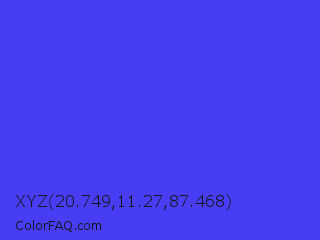 XYZ 20.749,11.27,87.468 Color is a normal indigo color and the nearest color is Palatinate Blue #273be2. Hex code #473df5 and RGB value is rgb(71,61,245). In RGB color space, this color is composed of 28% red, 24% green, 96% blue, In CMYK color space, this color is composed of 71% cyan, 75% magenta, 0% yellow , 4% black , In HSL color space, this color has a hue angle of 243° , 90% saturation and 60% lightness.