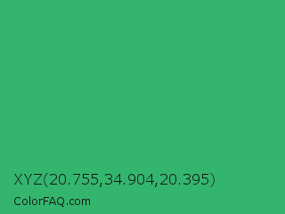XYZ 20.755,34.904,20.395 Color is a normal green color and the nearest color is Medium Sea Green #3cb371. Hex code #34b56e and RGB value is rgb(52,181,110). In RGB color space, this color is composed of 20% red, 71% green, 43% blue, In CMYK color space, this color is composed of 71% cyan, 0% magenta, 39% yellow , 29% black , In HSL color space, this color has a hue angle of 147° , 55% saturation and 46% lightness.