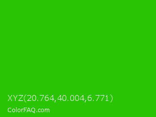 XYZ 20.764,40.004,6.771 Color is a normal green color and the nearest color is Harlequin Green #46cb18. Hex code #2bc405 and RGB value is rgb(43,196,5). In RGB color space, this color is composed of 17% red, 77% green, 2% blue, In CMYK color space, this color is composed of 78% cyan, 0% magenta, 97% yellow , 23% black , In HSL color space, this color has a hue angle of 108° , 95% saturation and 39% lightness.