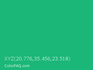 XYZ 20.776,35.456,23.518 Color is a normal green color and the nearest color is Green Crayola #1cac78. Hex code #1bb778 and RGB value is rgb(27,183,120). In RGB color space, this color is composed of 11% red, 72% green, 47% blue, In CMYK color space, this color is composed of 85% cyan, 0% magenta, 34% yellow , 28% black , In HSL color space, this color has a hue angle of 156° , 74% saturation and 41% lightness.