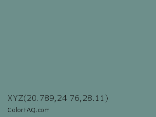 XYZ 20.789,24.76,28.11 Color is a normal cyan color and the nearest color is Juniper #6d9292. Hex code #6d8f8b and RGB value is rgb(109,143,139). In RGB color space, this color is composed of 43% red, 56% green, 55% blue, In CMYK color space, this color is composed of 24% cyan, 0% magenta, 3% yellow , 44% black , In HSL color space, this color has a hue angle of 173° , 13% saturation and 49% lightness.