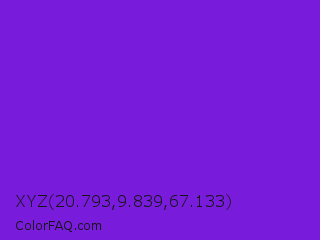 XYZ 20.793,9.839,67.133 Color is a normal violet color and the nearest color is Blue Violet #8a2be2. Hex code #781bda and RGB value is rgb(120,27,218). In RGB color space, this color is composed of 47% red, 11% green, 85% blue, In CMYK color space, this color is composed of 45% cyan, 88% magenta, 0% yellow , 15% black , In HSL color space, this color has a hue angle of 269° , 78% saturation and 48% lightness.